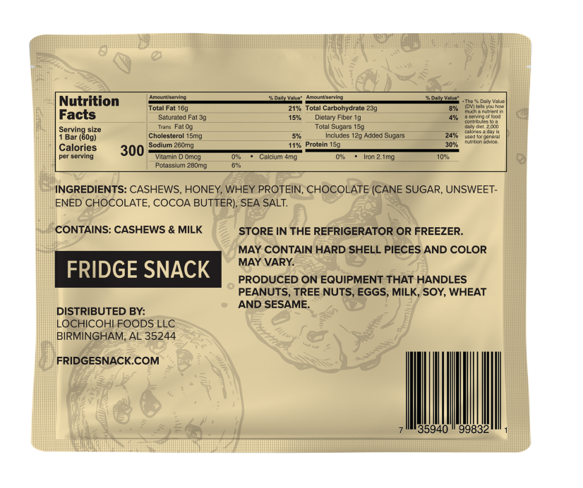 Ingredients: Cashews, Honey, Whey Protein, Chocolate Chips(cane sugar, unsweetened chocolate, cocoa butter), Sea Salt.